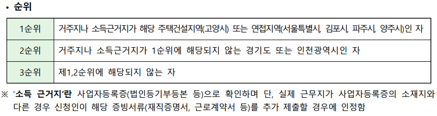 지난번 행복주택 글을 보셨던 분들을 아시겠지만 고양시에 살지 않아도 소득근거지가 1순위에 속하면 1순위로 신청 되기 때문에 이 부분 놓치지 마세요!